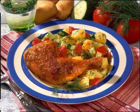 Dice potatoes, cucumber and tomato. Mix everything. Remove the drumstick. Dissolve the meat with broth. Add herbs and cumin. Mix with salad ingredients.