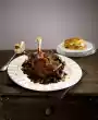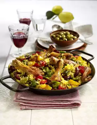 Heat oil in a pan and fry the chicken legs briefly while turning. Remove the chicken legs from the pan. Add onions, garlic and cabanossi to the hot frying fat and fry lightly. Add the bell peppers and fry briefly. Finally, mix in the frozen peas and rice. Season with pepper and put everything in a paella pan (approx. 32 cm Ø, approx. 2.5 litres capacity). Spread chicken legs on top and press them lightly into the rice. Heat the stock, add saffron and pour into the paella pan. Cook in the preheated oven (electric cooker: 200 °C/ convection oven: 175 °C/ gas: level 3) for about 40 minutes.