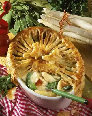 Pour into a casserole dish. Place puff pastry sheets on top of each other and roll out 4-5 cm larger than the diameter of the form. Separate the egg. Brush the edges of the mould with egg white and place the pastry lid on top.