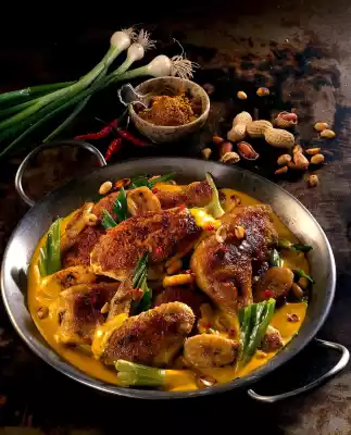 Cut the chicken and wash it thoroughly under cold running water, dab dry and rub with salt, pepper and curry. Heat oil in a frying pan and fry the chicken parts on both sides. In the meantime, clean and wash the spring onions and cut them into pieces. Wash the chillies and cut into rings. Add the spring onions and half of the chillies to the roaster, deglaze with cream and stock. Let the curry chicken braise for about 40 minutes.