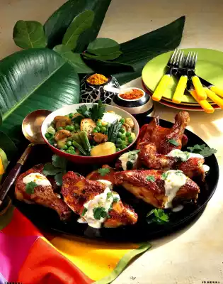 Season the remaining yoghurt with salt, pepper, sugar and curry. Arrange chicken pieces and yoghurt dip on a plate and serve sprinkled with coriander. Add vegetables garnished with coriander and sprinkled with pepper.