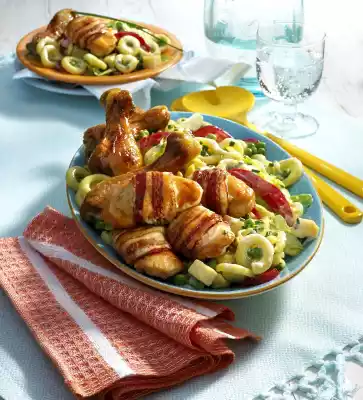 Mix honey and mustard and brush the legs with it 10 minutes before the end of the cooking time. Cook the pasta in boiling salted water according to the instructions on the packet. Add peas to the noodles 5 minutes before the end of cooking time. Wash and clean the peppers and cut them into rings. Clean, wash and cut the salad into pieces. Cut cheese into cubes. Mix yoghurt, salad cream and lemon juice. Season with salt, pepper and sugar. Pour pasta on a sieve, rinse with cold water and drain. Mix all the prepared ingredients and let it stand for a while.