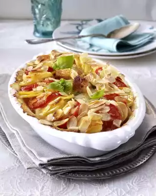 Spread butter in flakes on top, sprinkle with almonds. Bake in the preheated oven (electric cooker: 200 °C/ convection oven: 175 °C/ gas: level 3) for 40-45 minutes. If necessary, cover the casserole with aluminium foil 10-15 minutes before the end of the baking time.