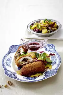 Roast the walnuts in a pan without fat. Take them out, let them cool down a bit and chop them roughly. Clean the lamb's lettuce and wash thoroughly. Clean radicchio and cut into thin strips. Season potato salad with salt and pepper. Fold lamb's lettuce, walnuts and radicchio into the potato salad. Arrange chicken roulades with potato salad on plates. Serve with cranberries