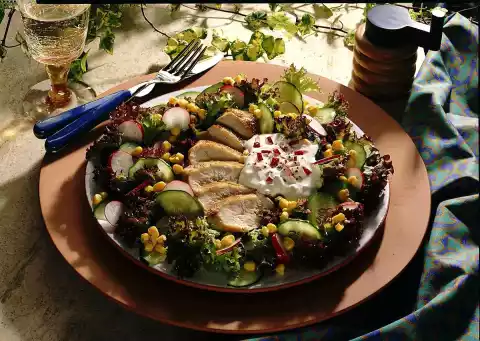 Season to taste with salt and pepper. Cut the chicken fillets open and arrange on plates with the salad ingredients. Place radish slices on top.