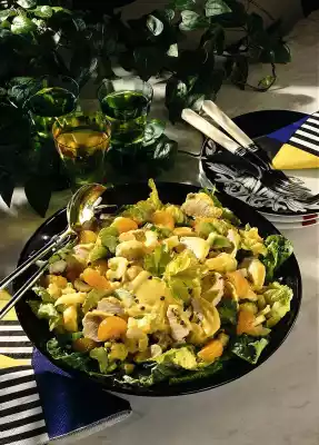 Wash the chicken filet and dab dry. Bring the stock to the boil, add the meat and cook on a low heat for 15-20 minutes. Leave to cool in the broth. In the meantime, clean and wash the celery and put the green aside. Cut the celery stalks into slices. Clean, wash and quarter the salad and cut into wide strips. Drain the mandarins.