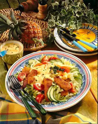 In the meantime, mix salad cream, yoghurt and 2 tablespoons of pineapple juice. Season to taste with salt, sugar and curry. Stir in pineapple pieces and green pepper. Arrange the salad and lukewarm chicken sticks with the sauce on a large plate.