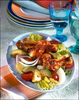 Wash the legs and pat dry. Put them on a baking tray and spread with ketchup. Drizzle with olive oil and 2 tablespoons of lemon juice. Season with salt and crushed chilli. Cover and leave to stand for about 30 minutes. In the meantime, for the salad, peel the vegetable onion and cut it into fine slices.
