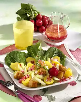Whip the vinegar and 2 tablespoons of oil. Season to taste with salt, pepper and sugar. Fold in radishes. Arrange salad ingredients on plates. Add some vinaigrette. Serve garnished with radishes.