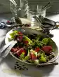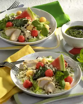 Puree the herbs, pine nuts, parmesan and garlic in the universal chopper, adding the rest of the oil. Season to taste with salt and pepper. Arrange rice, salad and melon on plates. Add some pesto. Garnish with basil. Add the rest of the pesto extra