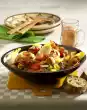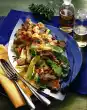 Cook the rice in plenty of boiling salted water for about 15 minutes, drain on a sieve. Season chicken filet with salt and pepper. Heat 2 tablespoons of oil in a pan. Fry the meat for about 12 minutes. Turn from time to time, take out and let cool down.