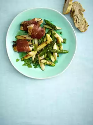 Add lemon and orange juice, add maple syrup and let it boil down a bit. Season to taste with salt and pepper. Stir in 1 tablespoon of oil. Pluck the chervil from the stems and chop coarsely if necessary. Briefly mix asparagus with orange vinaigrette in the pan and sprinkle with the chervil leaves. Arrange the lukewarm asparagus salad with the chicken saltimbocca. Serve with crispy white bread