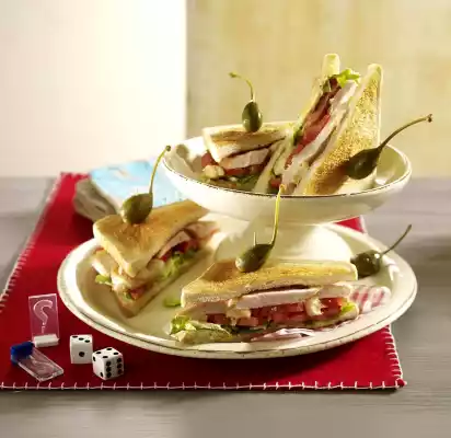 Place 1 toast slice on each. Stick caper apples with wooden skewers on the sandwiches. Cut bread diagonally in half and arrange.