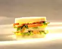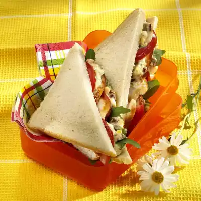 Season to taste with salt and pepper. Wash the tomato, dab dry and cut into thin slices. Clean the rocket, wash and drain well. Cut the chicken filet into thin slices. Thickly spread sandwich toast slices with the egg cream and cover 2 slices with rocket, tomato and chicken. Cover with the two remaining slices, press lightly and cut through diagonally