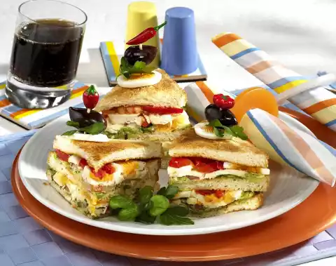 Toast bread. Cut fillet and eggs into slices. Mix mayonnaise and mustard. Season with salt and pepper. Spread 4 toasts with mustard mayonnaise and top with lettuce, tomatoes, eggs, chicken and paprika. Place 2 toasts on top of each other and cover each with a slice of toast. Quarter diagonally, pin and garnish if necessary