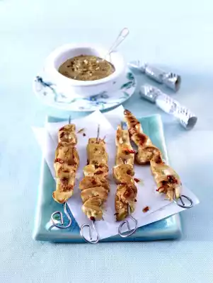 Sauté onion, garlic and remaining chilli in it. Add coconut milk and peanut butter, bring to the boil while stirring. Season to taste with lime juice, lime zest and some Sambal Oelek. Heat 2-3 tablespoons of oil in a large frying pan. Add saté skewers in 3 portions and fry for 3-4 minutes on each side. Season with salt and pepper. Pass the peanut dip to the saté skewers