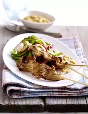 Stir in yoghurt and season with salt and pepper. Wash the meat, dab dry and cut lengthwise into 12 thin slices. Put on wooden skewers. Season with salt. Heat 4 tablespoons of oil in a pan and fry the skewers in portions for about 2 minutes, turning them over.