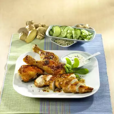 Peel and chop the ginger and garlic. Wash, seed and chop the chilli. Mix everything with oil and juice. Wash chicken parts, dab dry. Halve legs at joint. Mix the meat with the marinade. Cover and chill for 6-8 hours, e.g. overnight. If necessary, turn 1x in between.