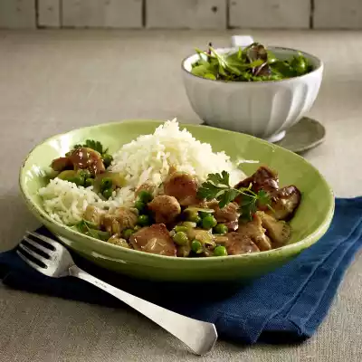 Sauté the onion in the frying fat. Sprinkle with flour and sweat. Well 1⁄4 l water, milk and broth stir in, boil up and simmer everything 3-5 minutes. Heat peas, meat and parsley in the sauce.