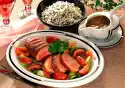 Season to taste with salt and pepper, heat the meat and tomatoes in it, fold in the kiwi. Serve the shredded meat with the rice. Garnish with mint.