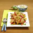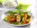 Put rice in boiling salted water and let it swell for 20 minutes. Cut chicken fillets into strips. Heat the fat in a pan and fry the fillet strips in it until golden brown. Season with salt and pepper and remove.