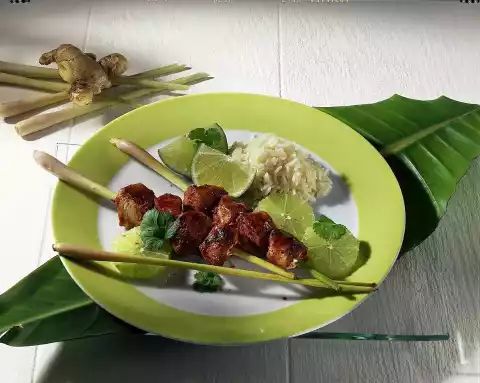 Skewer on the sharpened lemon grass. Pour the marinade over the skewers. Leave in the fridge for 2-3 hours. Put rice into boiling salted water. Leave to swell on low heat for about 20 minutes.