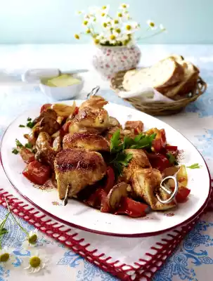 Season skewers with salt, pepper and paprika powder. Remove and keep warm. Fry the peppers, mushrooms and onions in hot frying fat. Stir in tomato paste, sweat briefly. Deglaze with 200 ml water.