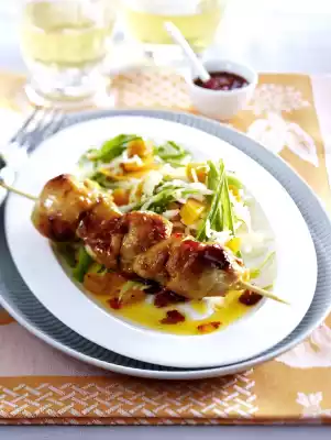 Now wash the meat, dab dry and cut into large cubes. Put the chicken cubes on 4 skewers (tip: oil the wood beforehand to make it easier). Season with salt and pepper. Heat 2 tablespoons of oil in a pan and fry the skewers all around for about 8 minutes.
