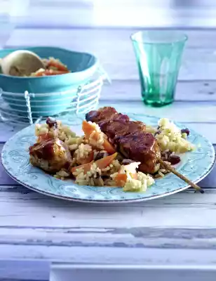 Mix ketchup, soy sauce, cumin and a little pepper. Spread the meat with it. Heat oil in a pan and fry skewers in it for about 5 minutes until brown. Serve with the carrot-raisin rice.