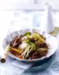 Rinse raisins hot and drain. Peel and chop the onion. Peel and wash the carrots, cut them in half lengthwise and cut them into diagonal pieces.