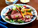 Squeeze the juice out of the parting skins. Mix juice, orange peel, vinegar, honey, salt and pepper. Add 100 ml oil.