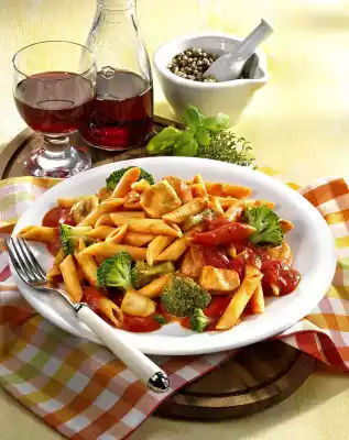 Wash the meat, dab dry and dice. Peel and finely chop the onion. Clean and wash broccoli and cut into florets. Cover broccoli and cook in little boiling salted water for 8-10 minutes. Cook pasta in salted water according to package instructions.