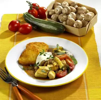 Season with salt and pepper. Add zucchini and tomatoes, fry briefly. Deglaze with stock and white wine. Add herbs, bring to the boil. Flavour again and arrange in portions with the roasting wedges. Serve with 1 blob of crème fraîche