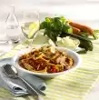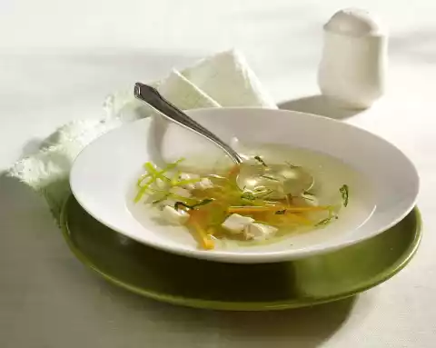 Cut the remaining carrot, leek and celery into fine strips. Remove the chicken breast. Line a sieve with kitchen paper, pour broth through the sieve and collect in a pot. Remove meat from skin and bone and cut into small cubes.