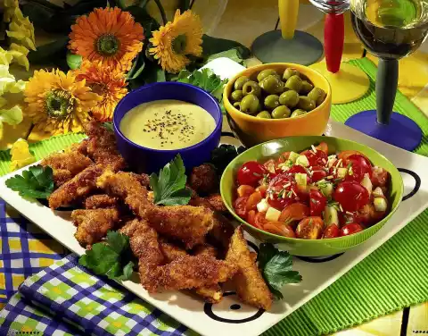 Fry the breaded meat in it in two portions over medium heat for four to five minutes while turning. Arrange the chicken sticks on a plate, garnished with parsley as desired, and add the tomato salad.