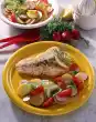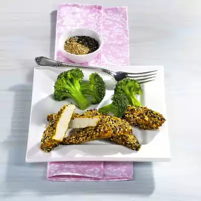 Roast the sesame seeds in a pan without fat, remove and allow to cool. Wash the chicken filet, dab dry and cut into 4 strips. Mix soy sauce, mustard, 2 teaspoons water and turmeric. Turn chicken strips in the paste, sprinkle with sesame seeds and place in a lightly oiled or non-stick, ovenproof pan or dish. Bake in a preheated oven (electric cooker: 175 °C/ convection oven: 150 °C/ gas: level 2) for 12-15 minutes. In the meantime, clean and wash the broccoli and steam it for 8-10 minutes in little boiling salted water. Arrange chicken sticks and broccoli on a plate
