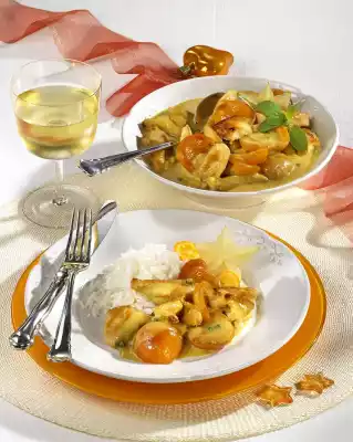 Sprinkle everything with flour and 3 teaspoons of curry and sauté. Stir in just under 1/2 l water, about 100 ml apricot juice, cream, stock and green pepper. Bring to the boil and simmer for about 5 minutes. Season to taste with salt, pepper and possibly curry. Arrange and garnish. Goes well with rice (e.g. basmati)