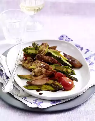 Heat the oil and fry the meat for about 10 minutes while turning. After 4 minutes add asparagus and shallots. Season with honey, salt and pepper. Add tomatoes and deglaze with vinegar, bring to the boil and simmer for about 1 minute.