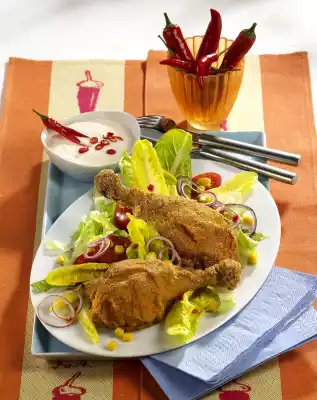 Skin chicken legs, rinse and pat dry. Season with salt and pepper. Put polenta in a bowl and mix with salt, cumin, paprika and chilli powder. Put flour in a second bowl.