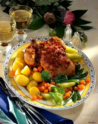 Place the chicken with the breast side down, cover with flakes of fat and roast, without lid, in a preheated oven (electric range: 200 °C/ gas: level 3) for approx. 1 1/4 hours. Turn the chicken after approx. 30 minutes. In the meantime, clean and wash the potatoes, kohlrabi, carrots and mangetouts. Put some kohlrabi leaves aside for garnishing. Dice the carrots and cut the kohlrabi into slices. Halve the potatoes if necessary. Bring the vegetable stock to the boil and cook the potatoes for about 20 minutes. Add kohlrabi and carrots halfway through cooking. Add sugar snap peas and cook for the last 5 minutes. Wash parsley, dab dry and chop finely. Spread the rest of the onion-bacon mixture on the chicken about 20 minutes before the end of the cooking time and brown as well. Arrange chicken and drained bouillon vegetables on a plate.