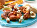 In the meantime, wash the mint, shake dry and pluck the leaves from the stalks. 2-3 minutes before the end of the cooking time, stir the mint leaves under the relish, except for some for garnishing. Season the relish again with salt and pepper. Arrange the meat cubes in spoons, garnished with some relish and mint leaves
