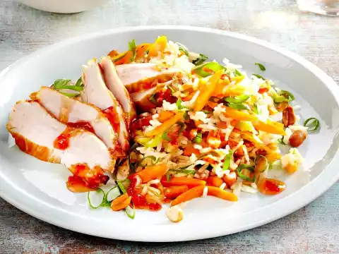 Fry the carrots in 2 tablespoons of hot oil in a second pan. Add rice and 8 tbsp. water, continue to steam for about 3 minutes. Then fry over high heat for about 5 minutes. Coarsely chop the nuts. Fold in nuts, spring onions, soy sauce and 4 tbsp. chilli sauce. Season to taste with salt and pepper. Serve with chicken, add the rest of the chilli sauce.