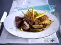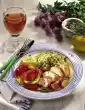 Turn the potatoes in between and baste the chicken with the frying fat. Ten minutes before the end of the cooking time, place lemon wedges in the fat pan. Remove the fat pan and let the chicken rest for five minutes. Cut the chicken into eight portions with a pair of poultry shears. Arrange chicken, feta cheese and tomato filling, potatoes and lemons on plates. Garnish with olives and bay leaves