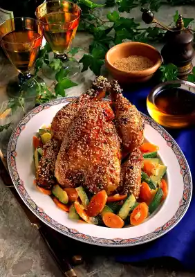 Cut carrots diagonally into slices, zucchini into sticks. Steam vegetables in little boiling salted water for about 10 minutes. Peel and finely dice onion. Melt the remaining fat, fry the onion in it until transparent and toss the drained vegetables in it. Season with lemon pepper and keep warm. Spread chicken with honey, sprinkle with sesame seeds and fry for another 10-15 minutes. Arrange the chicken on the vegetables and serve