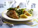 Remove the roaster from the stove. Remove the meat. Mix the egg yolks and 2 tablespoons of hot sauce. Stir into the rest of the sauce and thicken with it (do not bring to the boil again!). Season to taste with salt and pepper. Arrange everything. Garnish with the rest of thyme