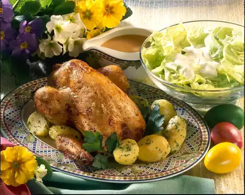 Wash the chicken thoroughly under running water and dab dry. Peel and halve the onion. Mix oil, salt, pepper and paprika and coat the chicken inside and outside with it. Put the filling into the chicken and plug it in. Tie the legs and wings together with kitchen string. Place the chicken on the fat pan of the oven rinsed with water. Bake in the preheated oven (electric: 200°C/ gas: level 3) for about 1 hour. After half of the cooking time, pour on the broth. In the meantime, clean and wash the potatoes and halve them as desired. Cook in boiling salted water for about 20 minutes. Clean, wash and drain the salad, pluck into bite-sized pieces and place in a salad bowl. Mix sour cream and vinegar. Season with salt, pepper and sugar and pour over the salad.