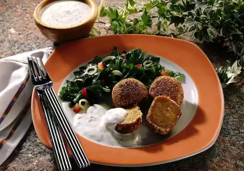 Form small balls from the mixture and roll them in sesame seed. Heat oil in a pan and fry the balls in it at medium heat until golden brown. Serve with the yoghurt sauce. For the salad, wash the parsley, dab dry and pluck the leaves from the stalks.