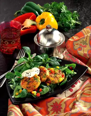 Stir in paprika, up to 3-4 tablespoons and season with a little salt and pepper. Form 12-14 buffers with your hands and sprinkle with black sesame seeds. Heat 2-3 tablespoons of oil in a pan and fry the buffers in it until golden brown, turning them carefully. Mix the remaining lemon juice and olive oil. Mix lamb's lettuce, parsley and lemon vinaigrette and divide into 4 plates. Arrange the buffers with a blob of yoghurt on top and serve sprinkled with remaining diced peppers and sesame seeds