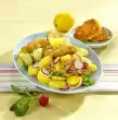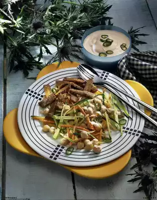 Mix sangrita, sour cream, salad cream and roast to a salad dressing, season with salt, pepper and lemon juice. Mix vegetables and chickpeas in the salad dressing, arrange escalope strips on top.