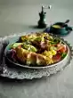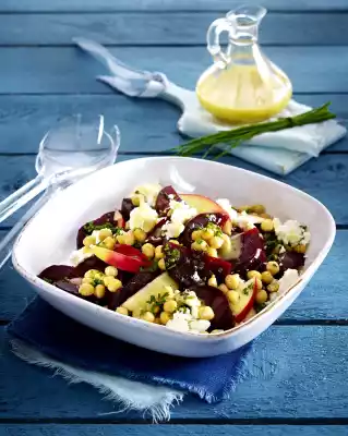 Mix vinegar, sugar, salt, pepper and mustard. Add the oil in portions. Wash the chives, shake dry and cut into fine rolls. Mix onion, beetroot, chickpeas and apples.